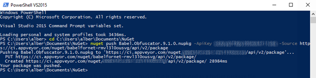 nuget push Babel.Obfuscator.9.1.0.nupkg -ApiKey <your api key> -Source https://ci.appveyor.com/nuget/<appveyor account feed>/api/v2/package