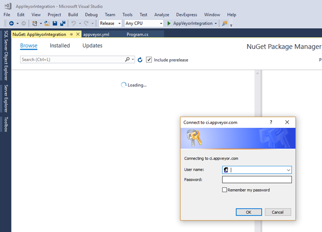 The first time you connect to AppVeyor Account feed, a popup will ask to enter your AppVeyor user name and password. Enter the credential used to login your AppVeyor account.